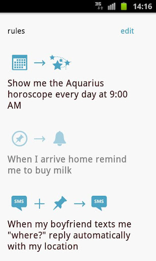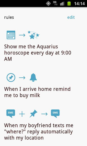 - Type de déclencheurs: Appli, Heure, Jour, Lieu, Etat, Evénement, Widget, Minuteur, Plugins