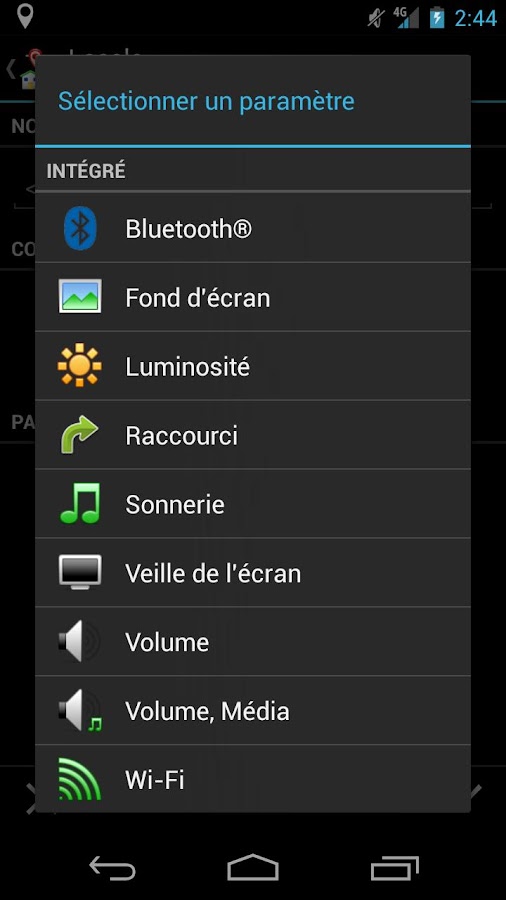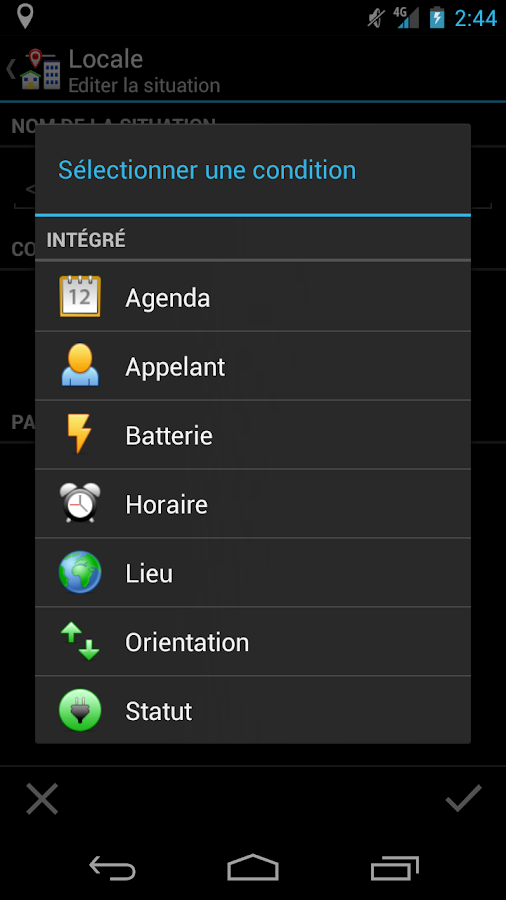 - De base, l'application gère de nombreuses fonctionnalitées : Batterie, Calendrier (Android 4.0 +), Heure, Localisation, Orientation, Bluetooth, Délai d'affichage, Luminosité de l'écran, Fond d'écran, Raccourci, Sonnerie, Volume, ...